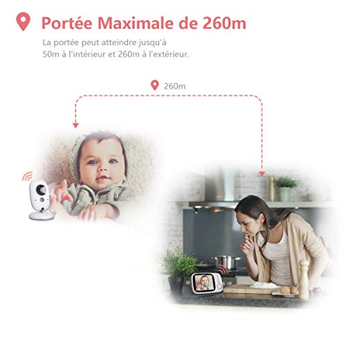 👶【Funzione Walkie-talkie】 L’interfono di questo baby monitor consente di parlare e comunicare con il bambino da una distanza di 50 metri all’interno e 260 metri all’esterno per rassicurare e calmare.