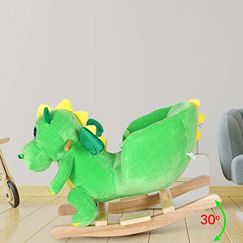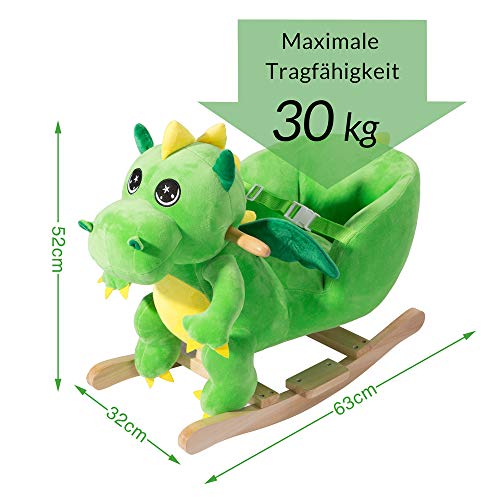 Il dinosauro a dondolo è dotato di due manici e di una robusta struttura in legno rivestita di peluche morbido imbottito. Utilizzare il dondolo sempre sotto la supervisione di un adulto!