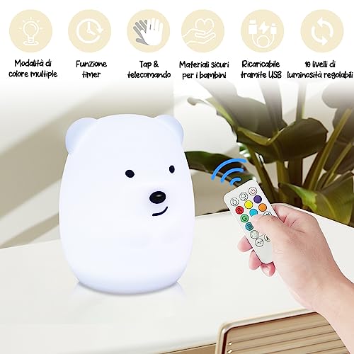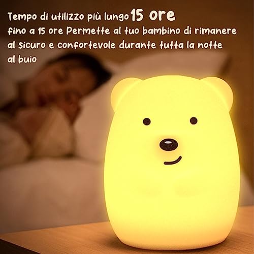 Telecomando: la luce notturna è dotata di un telecomando, che consente di regolare facilmente il colore e la luminosità della luce e di controllare la luce senza alzarsi dal letto. La luce notturna dell’orso può anche cambiare il colore della luce toccandola. Che si tratti di un compleanno, di una vacanza o di un’altra occasione speciale, questa luce notturna porterà loro calore e cura, rendendola un regalo unico e significativo