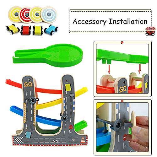 Nuheby Pista in Legno per Macchinine con 4 Auto da Corsa 4 Rampa Giocattolo Bambini Pista da Corsa Giochi Legno Regalo Ragazza Ragazzo 3,4,5,6 Anni