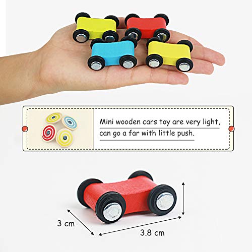 🍬Pista macchinine- Pista gioco è realizzato in legno sostenibile con vernici ecologiche e atossiche con 4 pista di plastica a zigzag. Include 4 MINI pista macchine colorati, 4 rampe macchinine e 1 set di parcheggio in garage.Dimensione pista giocattolo: 27 x 6,5 x 25,5 cm, Dimensione auto per bambini: 3,8 x 3 cm
